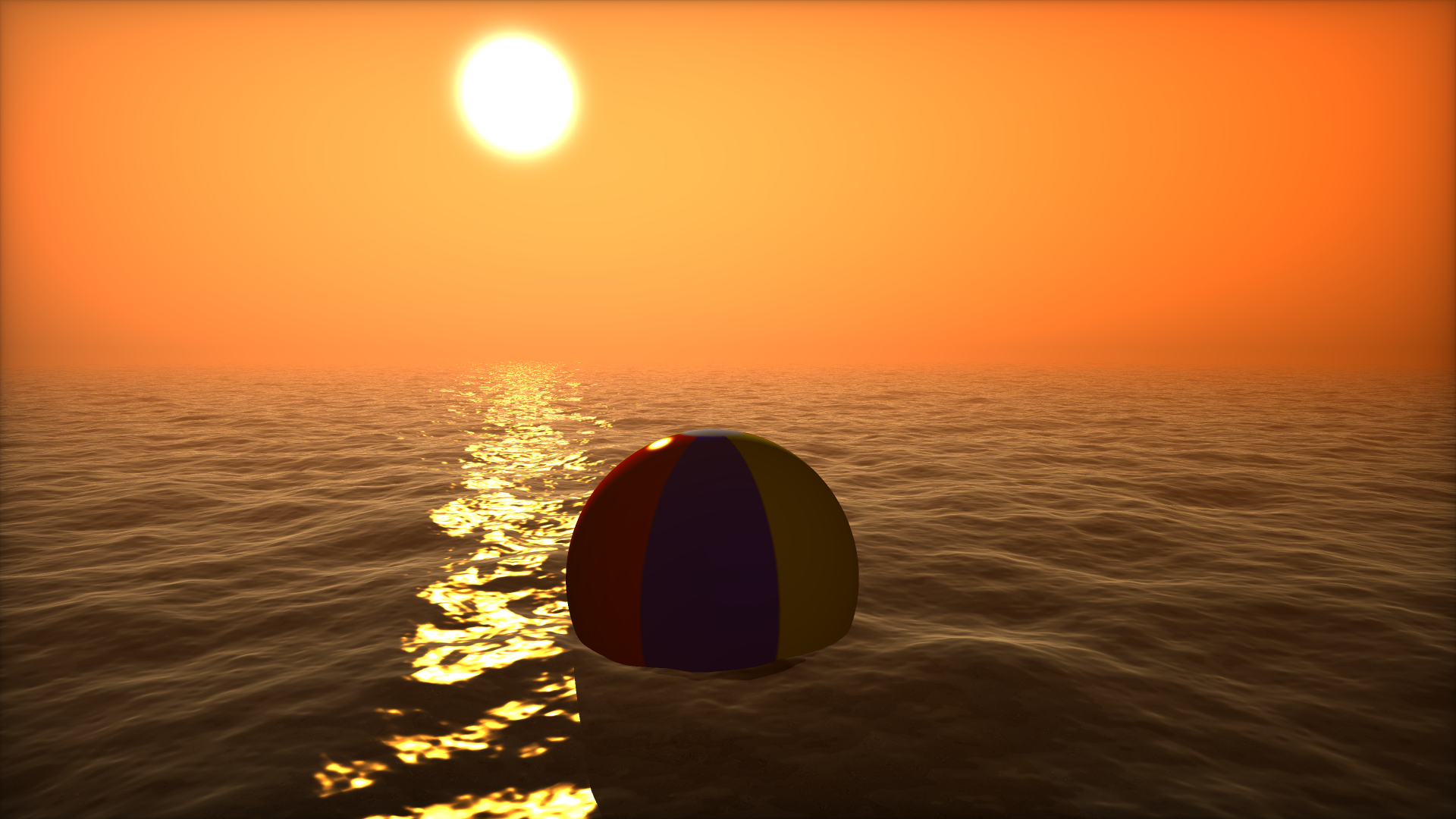 Ibiza Sunset - sunset shoreline with beach ball. This has multiple surface types and a simplified shadow test to keep the performance up. High-resolution render.