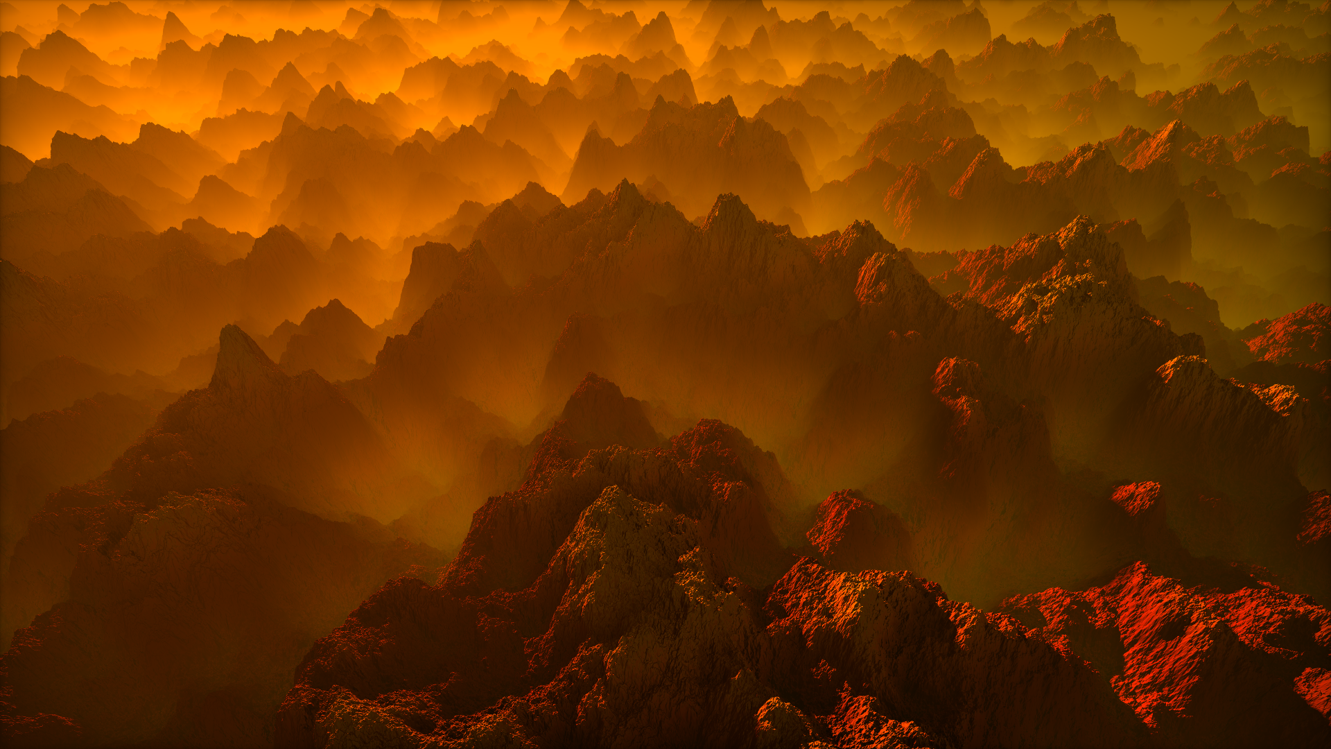 Circles of Hell - depth fogging and perlin noise based terrian marching. The fog and glowing rock colour creates quite a hellish atmosphere! High-resolution render with anti-aliasing.