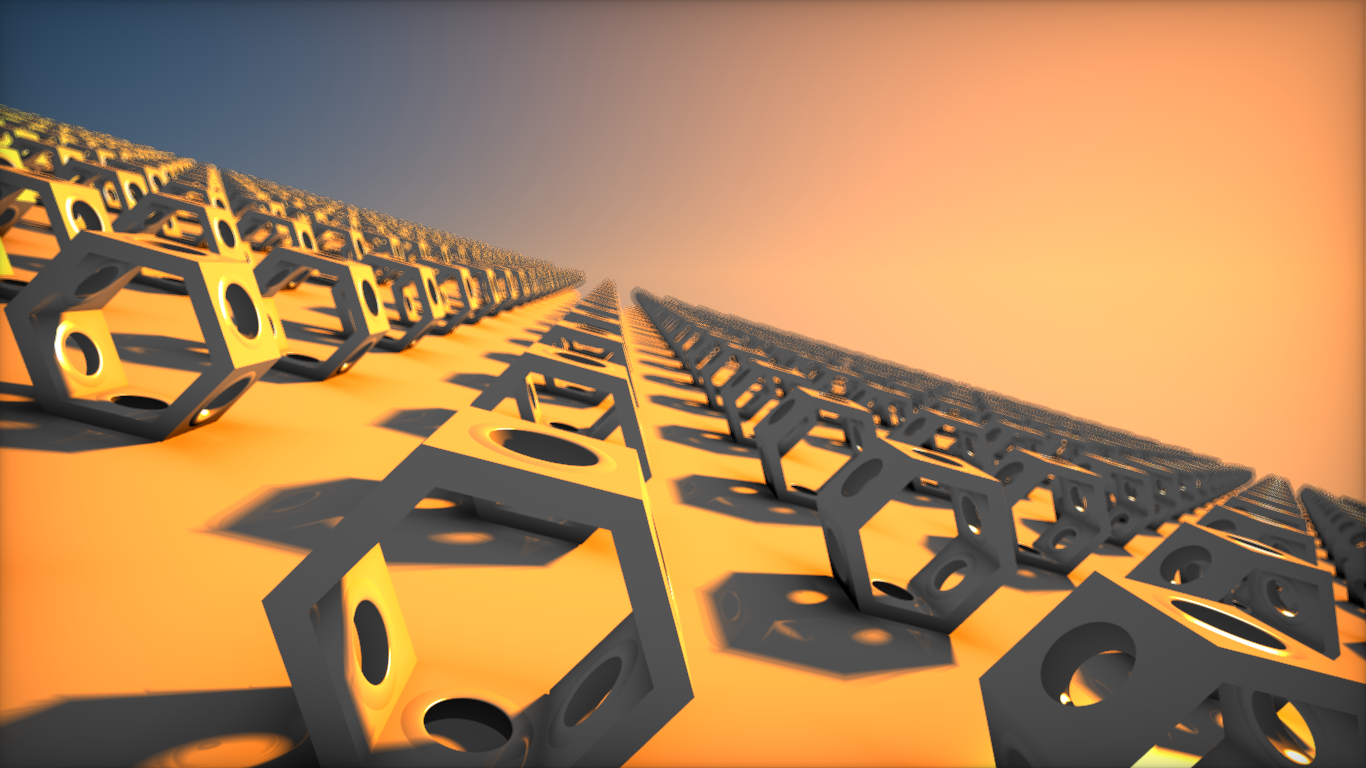 Distance Field - Lighting, shadows, AO and camera animation. High-resolution render with anti-aliasing and depth-of-field effect.