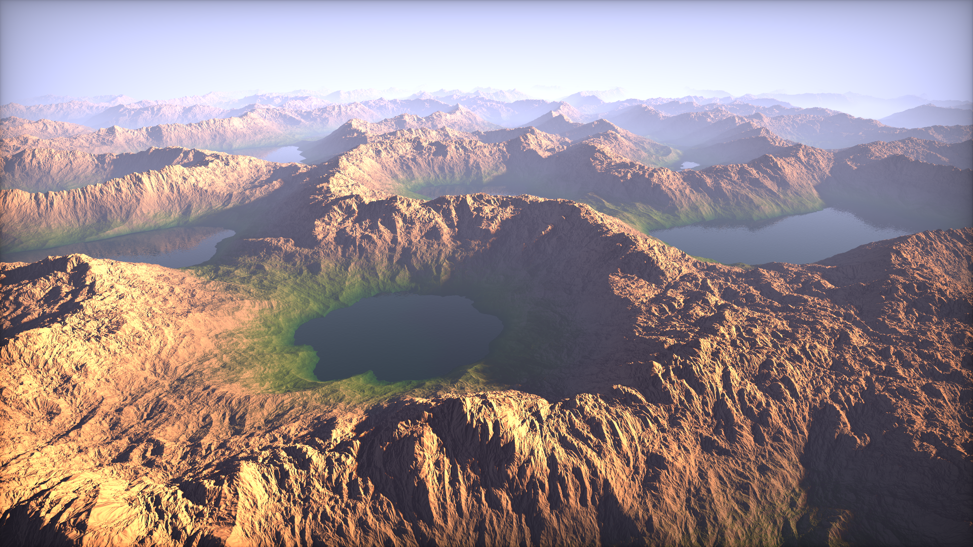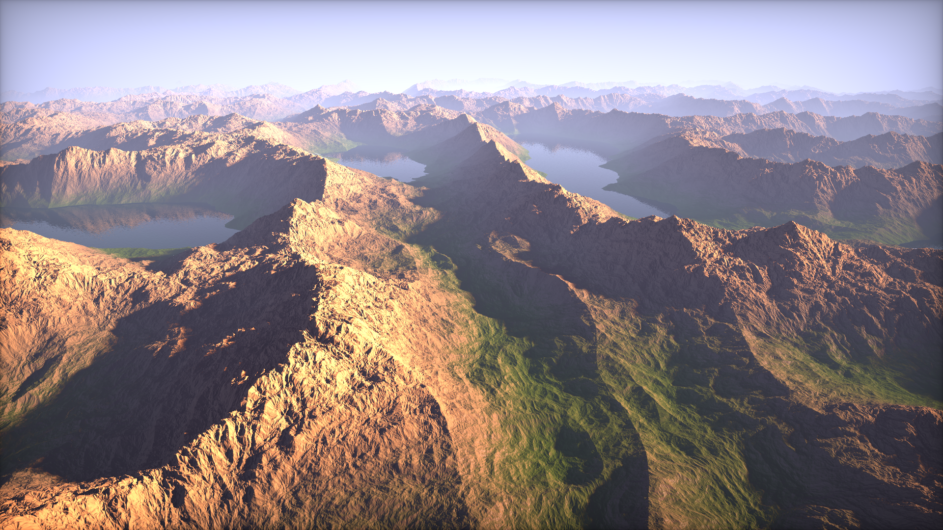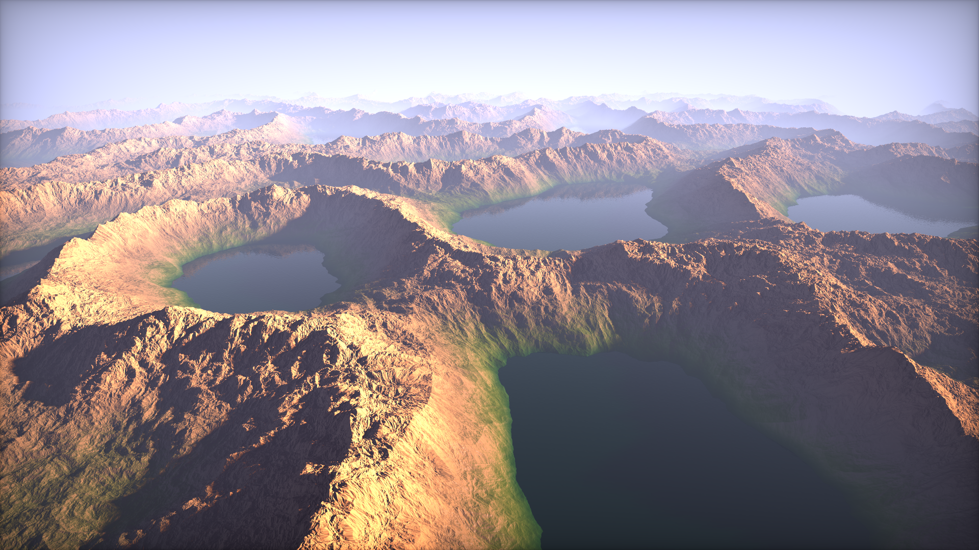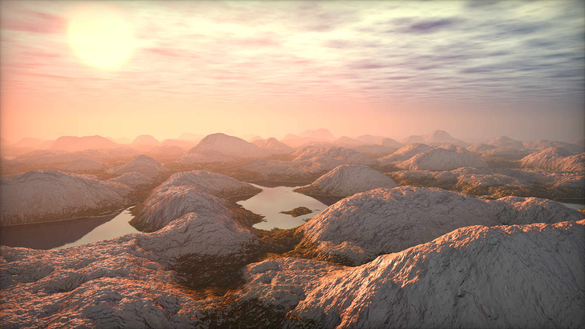 Really enjoyed experimenting with this terrain, so tried adding reflective water etc. which looks nice but was no longer real-time! Here are a few renders of the lakes in the mountains: [1] [2] [3]