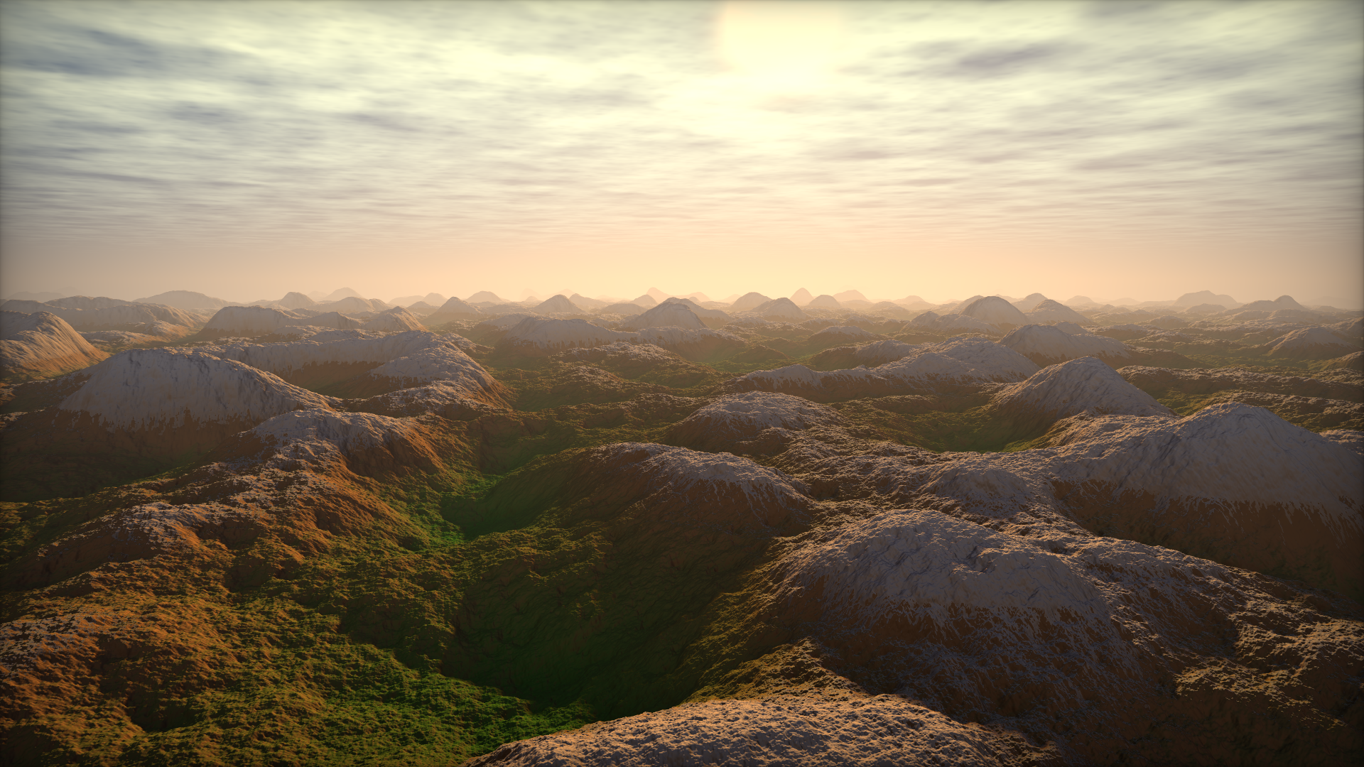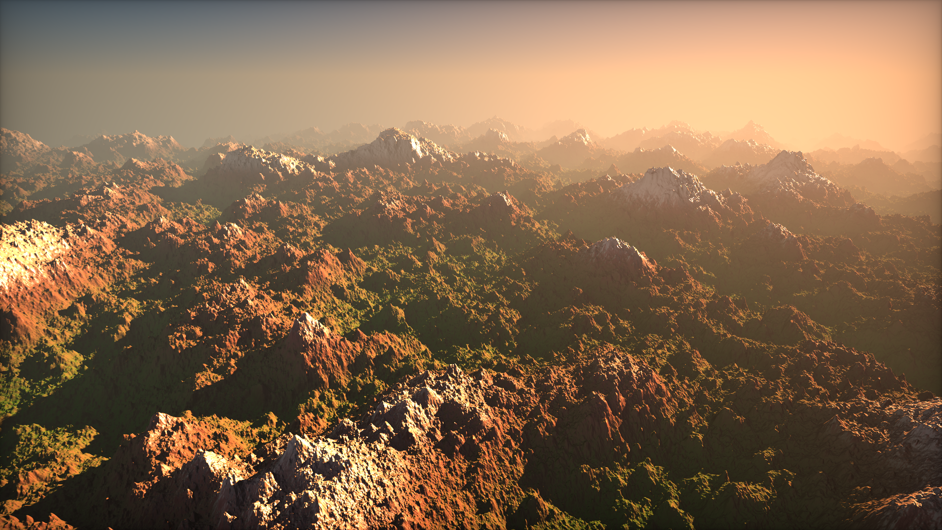 Mountains Terrain 2 - noise based terrain generation - this one has nice valleys with sharp peaks, details are smoother. Learnt more noise techniques from this article. High-resolution render with anti-aliasing, and another.