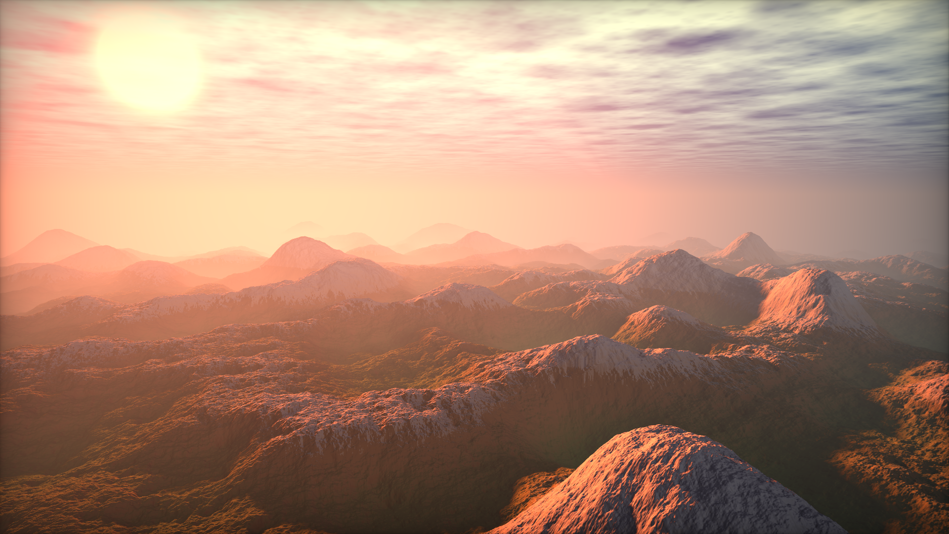Mountains (in the sunset) - several techniques combined and refined, including real-time fractal noise based terrain generation, natural lighting and height based fogging. Inspiration is again from IQ's amazing work. High-resolution render with anti-aliasing. Nice pink sunset version of same scene. Also a version with reflective water.