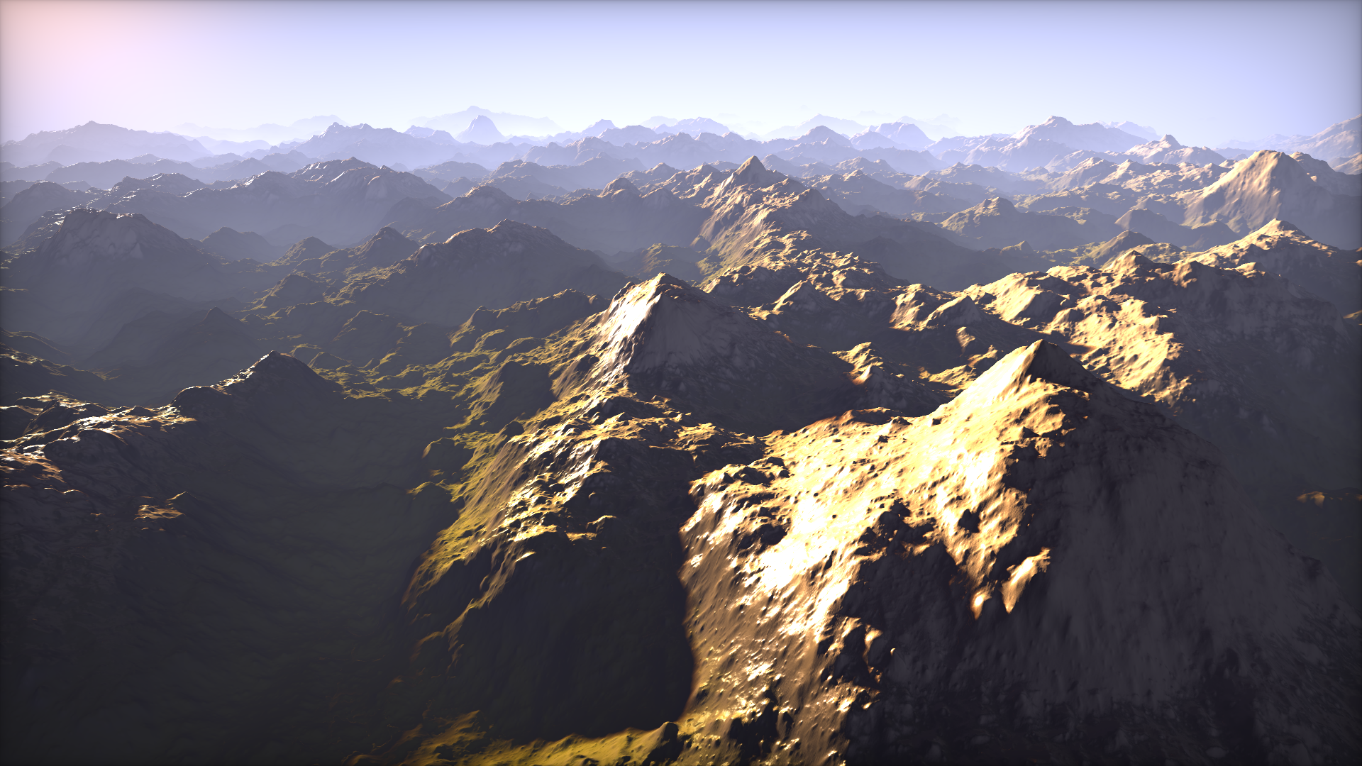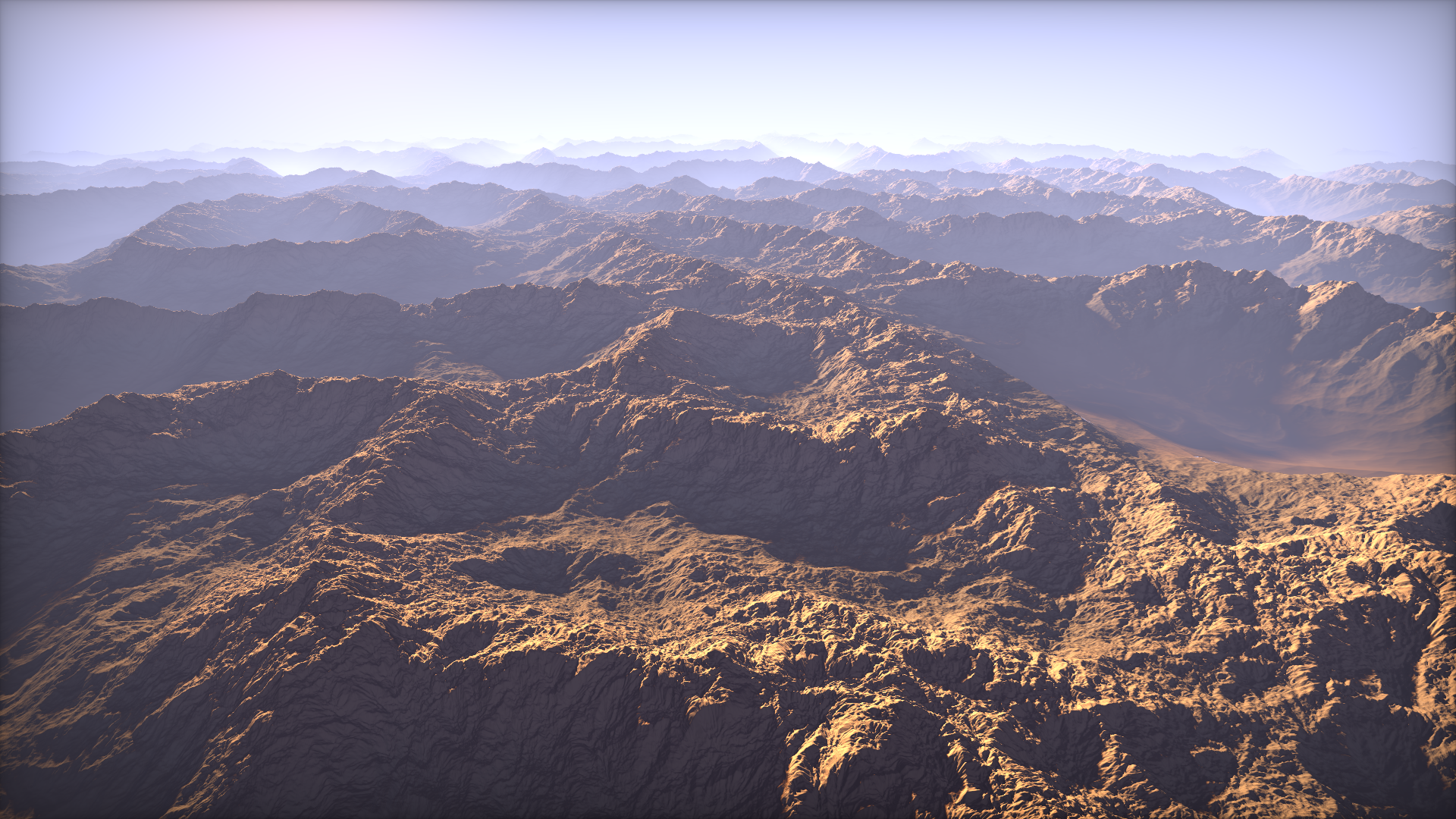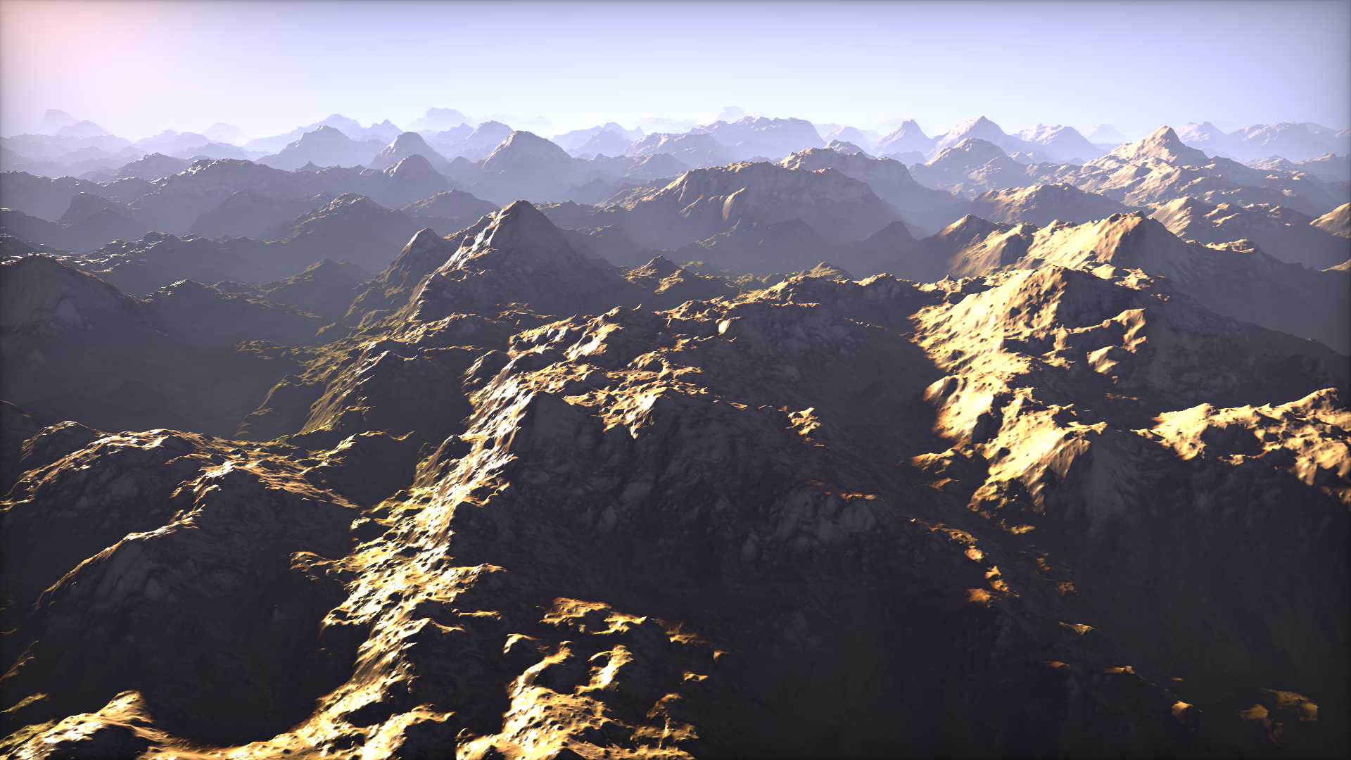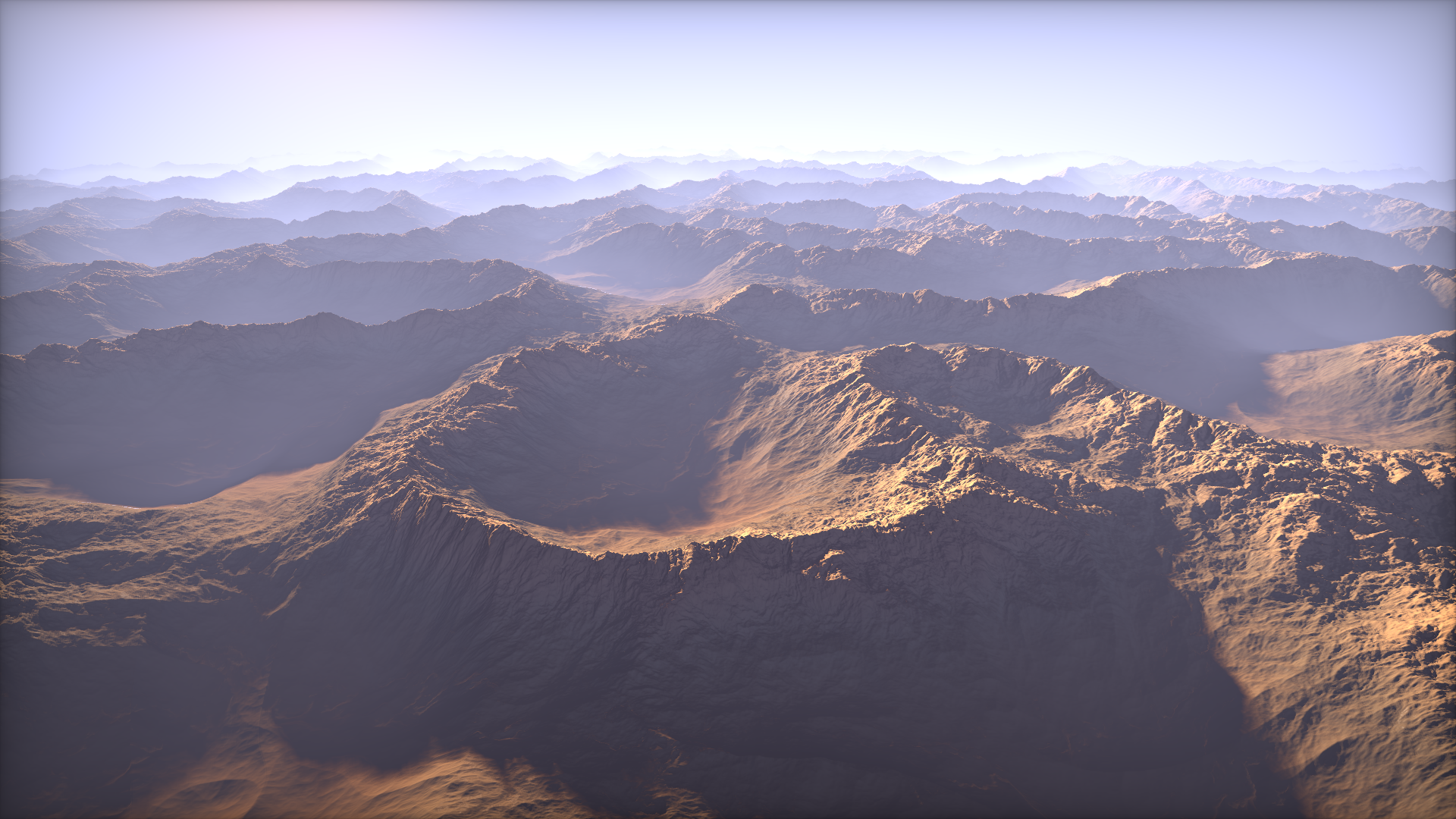 Mountains Terrain 1 - more real-time fractal noise based terrain generation, experimenting and learning new noise generation techniques. Trying to add detail to noise in interesting ways. High-resolution render with anti-aliasing.