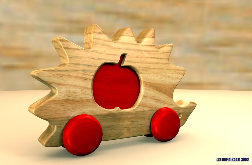 The wooden toy in the first image is an attempt to recreate an image found here that was produced using a comercial soft-shadow plugin called Shadow Designer from Evasion 3D. I created the object from scratch and tried to duplicate the soft-shadow effect without using a plugin.