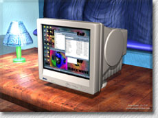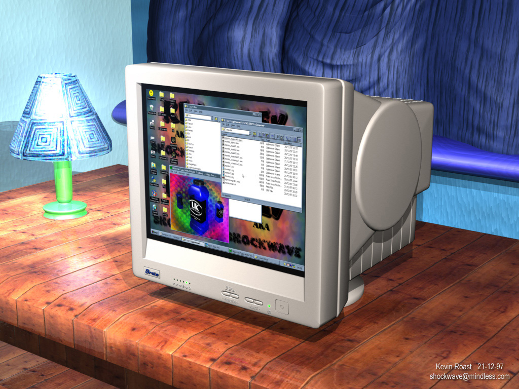 Objects in 3D scenes with bevelled edges look much more realistic and less 'computer generated'. The monitor a model of the acutal monitor I was using at the time and the screenshot is a snapshot from my Windows 98 desktop at the time.